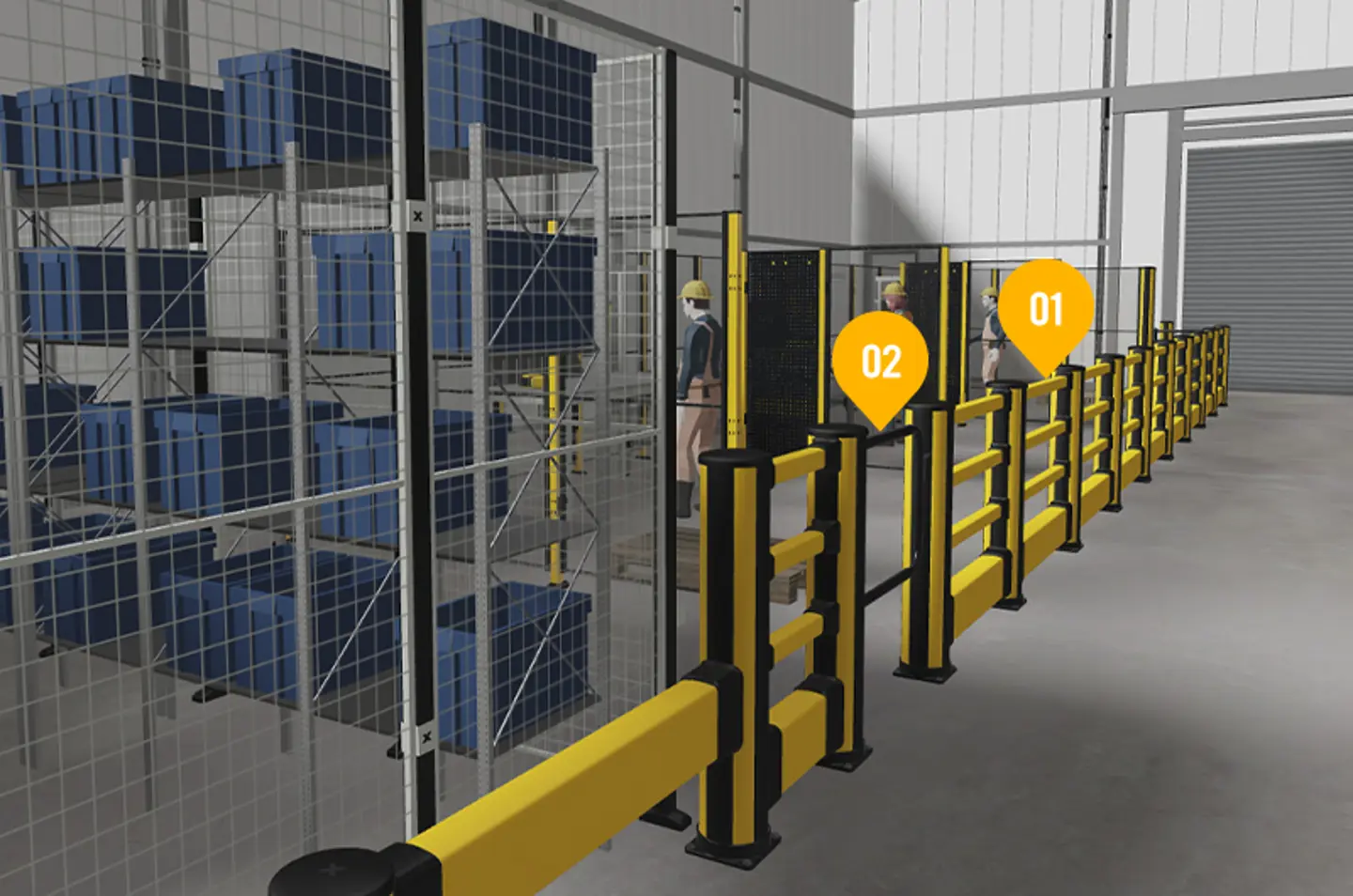 Kombination aus Rammschutz und Fußgängerbarriere, die Arbeitsplätze von einem Verkehrsweg trennt – Legende: 1 Fußgängerbarriere/Rammschutz, 2 selbstschließende Durchgangssperre